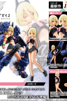 Megami Device Buster Doll Tank Midnight Fang, a color variation of Megami Device Buster Doll Tank, is ready for order! Equipped with the new “Machinica Block2-M” body, which has been very well received, she’s easy to assemble, with a new color scheme that looks like she’s tanned and wearing a swimsuit. She comes with three new painted face parts. The weapon parts, which have been changed to a dark color, are layered like multiple armor, and lots of joint holes and pins are included to encourage customization and expandability. Costume parts inspired by a sailor-suit uniform are included, and you can also assemble her as a “pure body” if you prefer. Parts replacement allows you to recreate her “armored mode” and “base body mode;” she comes with interchangeable hands, and her weapon-holding hands have been thoughtfully designed to be able to hold both rounded and square grips! A newly designed stand is included that will provide stronger support than previous versions. The 3mm joints and head are compatible with existing “M.S.G,” “Frame Arms,” “Frame Arms Girl,” “Hexa Gear,” “Sousai Shojo Teien,” “Arcanadia,” “Megalo Maria” and other series. Order her for your own collection today!