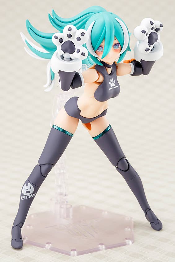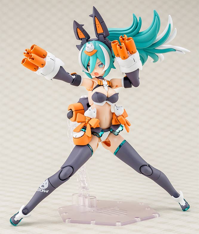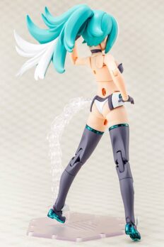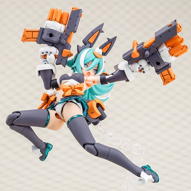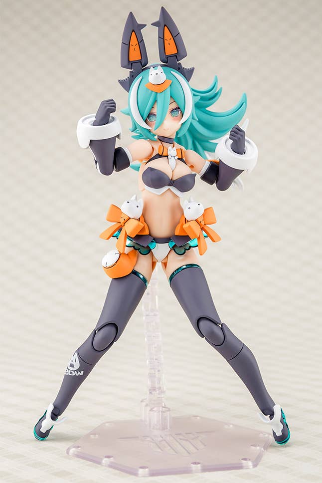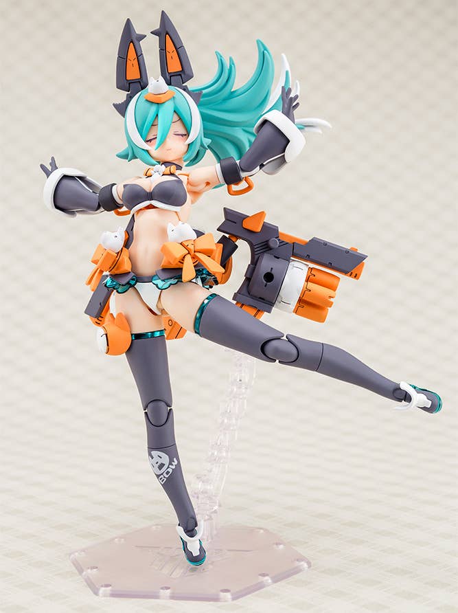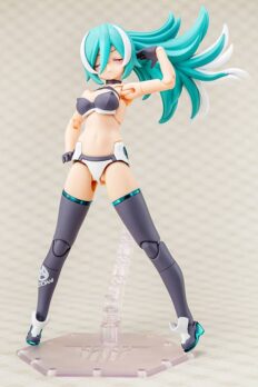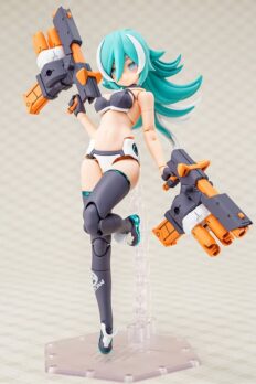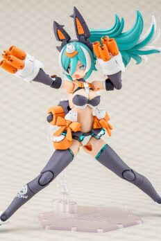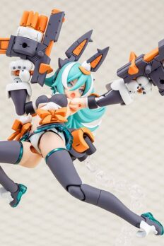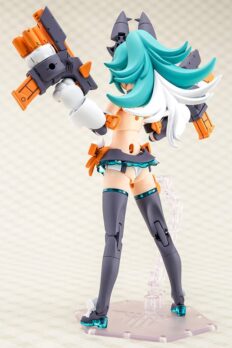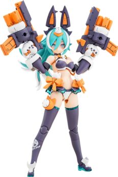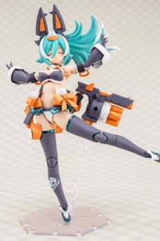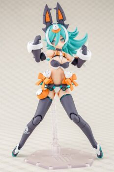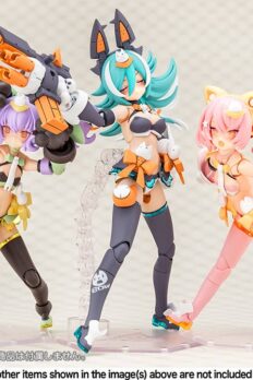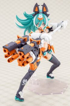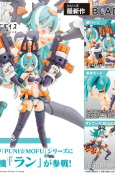 Lang is the newest addition to Kotobukiya’s “Megami Device Puni Mofu” action-figure model-kit lineup! She’s built on a Machinica Block2-M body designed by Asai Masaki, so she’s both cute and loaded with mature charm! She has a newly sculpted head, chest, and two large pistols; three different interchangeable faces drawn by BLADE are included. Stickers for her leg markings and accents are included too. She can be displayed in “base body mode” to enjoy her as a girl figure, or “armed mode” with various different parts attached. The twin “Howling PM5” pistols, her main weapons, can be attached to her arms or to her back to create a variety of action situations! Her body features an incredible range of motion for natural poses with weapons, and great seated poses too! A variety of weapons and joint parts are included, as is a stand for display; the 3mm-diameter joints located in various parts and the compatibility of the head allow each part to be used with existing “M.S.G,” “Frame Arms,” “Frame Arms Girl,” “Hexa Gear,” “Sousai Shojo Teien,” “Arcanadia,” and “Megalo Maria” series items too. Order her for your own collection today!
