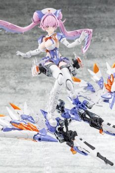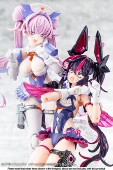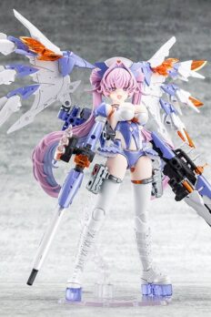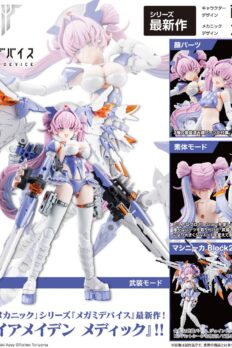 Desire Maiden Medic is the second in a new series compatible with Block 2 bodies from the creators of “Megami Device”! The character design is a combination of long-time eye print developer Amama and his design team, along with “Buster Doll” mechanical design by Tasuku. Desire Maiden Medic is inspired by a nurse, with features like a nurse’s cap and medical ampoules. Her delicate, long twin tails perfectly suit her soothing, expressive character; she comes with glasses molded in clear parts!